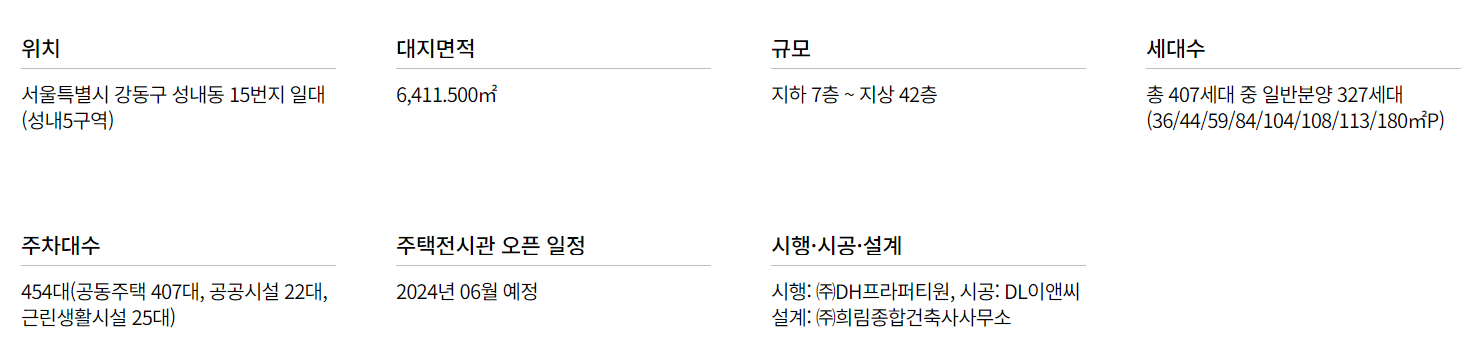 - 모델하우스(견본주택) : 서울 강동구 성내동 19-1번지