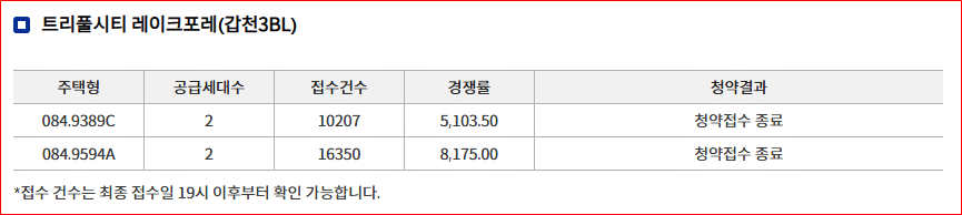 84㎡ A타입에는 총 16,350건수, 8,175.00대 1의 경쟁률과 84㎡ C타입에는 총 10,207건수, 5,103.50대 1의 경쟁률이 나왔습니다.