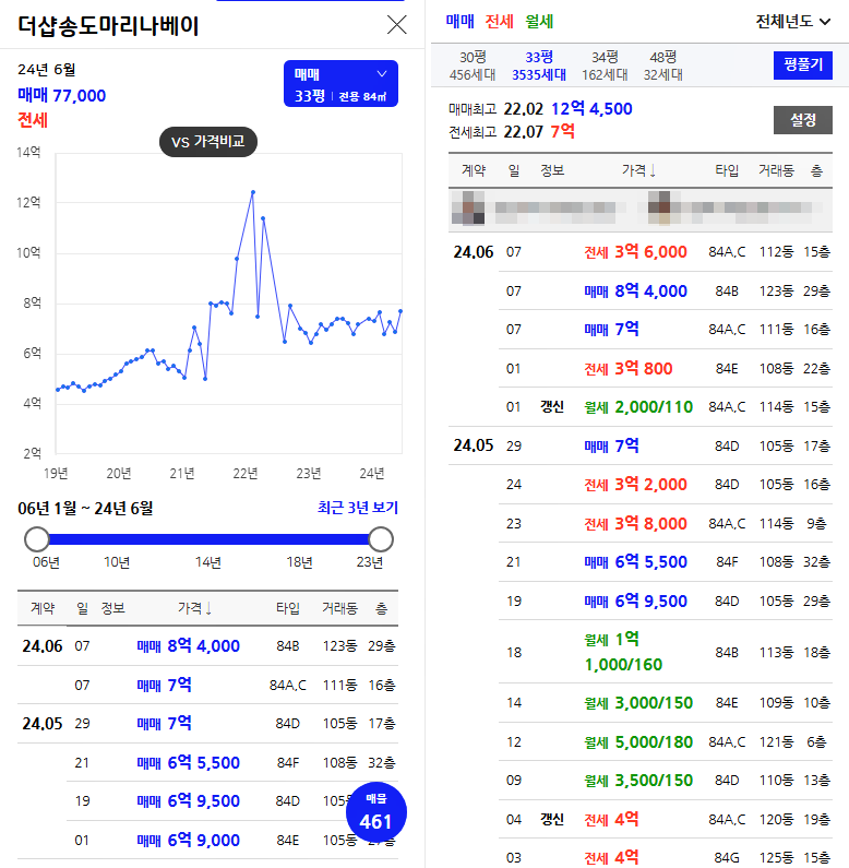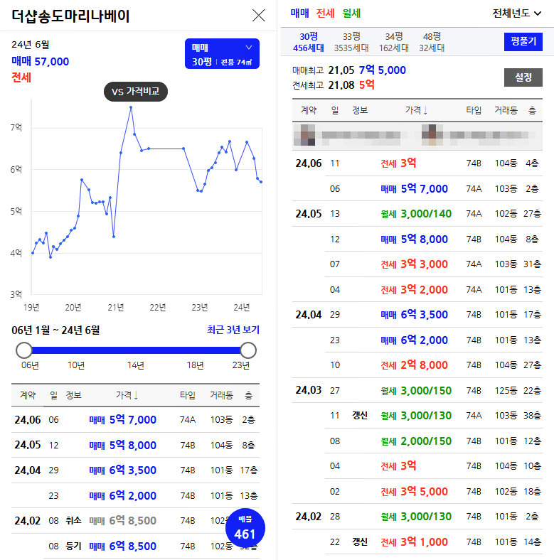 금회 공급하는 더샵 송도 마리나베이 아파트 조합원 자격 상실 세대는 총 50세대 아파트 시세는 아래 이미지(74타입, 84타입)를 참고하시기 바랍니다. 더샵 송도 마리나베이 아파트 분양 당시에는 전국 부동산 시장이 가격 상승세를 보이는 시점으로 2022년 3/4분기 시점에 호가장으로 부동산 가격들이 대체적으로 높은 시기였습니다. 해당 아파트 단지는 2021년 상반기부터 하반기까지 가격 상승 호가장이였으며 최근 하락세에서 다시 상승세로 접어든 상황입니다.