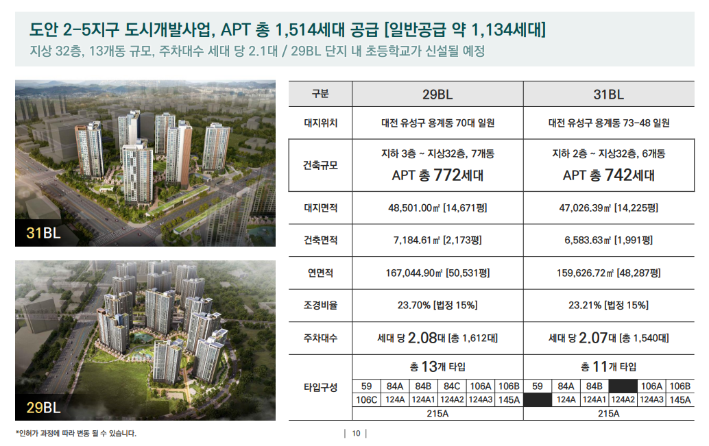 도안 푸르지오 디아델 아파트 단지는 대전 유성구 용계동 70번지 일원에 위치해 2개 블록(29블록, 31블록)으로 분양됩니다. 29블록 아파트 단지는 지하 3층, 지상 32층, 아파트 7개 동, 총 772세대이며 31블록 아파트 단지는 지하 2층, 지상 32층, 아파트 6개 동, 총 742세대로 두 블록 모두 공급 전용 면적 59㎡ ~ 215㎡ 다양한 평면 및 타입으로 조성됩니다.(사업개요 이미지 참고)