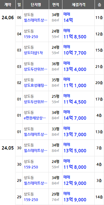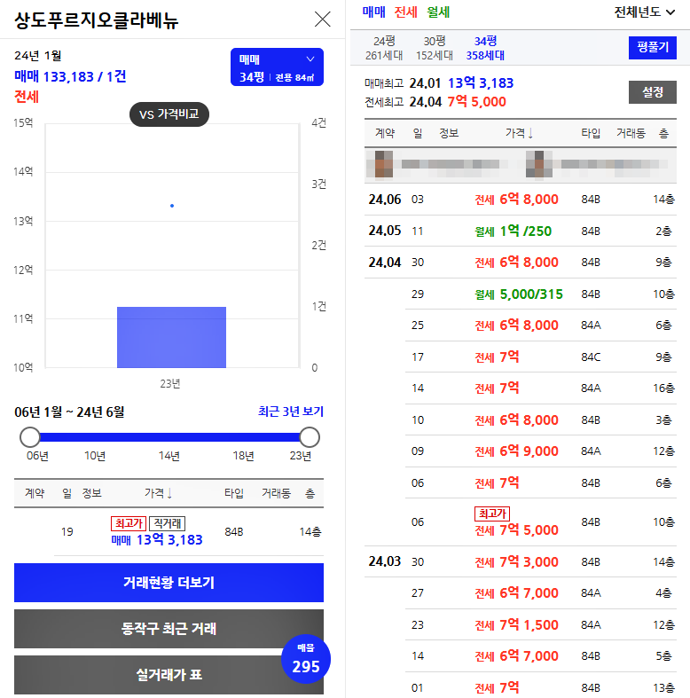 금회 공급하는 상도 푸르지오 클라베뉴 임의 공급 7차 무순위 청약은 84A타입 총 38세대입니다. 상도 푸르지오 클라베뉴 아파트 시세는 2024년 01월 직거래로 84타입 13억 3천에 거래가 되었습니다. 현재 전매 및 중개가 가능한 매물 동일 평형 시세의 경우 타입 및 층수 등 상이하나 약 10억 중반 ~ 13억 중반까지 형성되고 있고, 마이너스 프리미엄 매물도 간간히 있습니다.