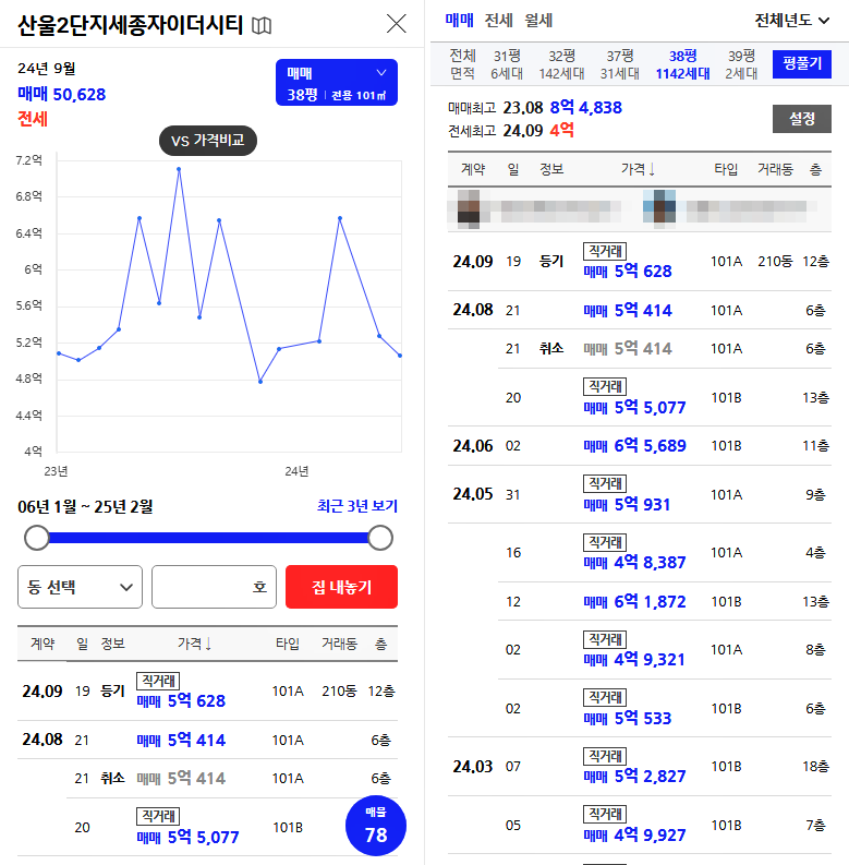 금회 공급하는 무순위 청약 세종시 산울동 자이더시티 L1블록 아파트 101B타입 시세 및 최근 실거래가입니다. 무순위 청약 1세대 총 분양가(발코니 확장비, 플러스 옵션, 가전 옵션)은 532,255,000원으로 2024년 하반기 마지막 거래로 약 5억 5천 중반에 거래가 되었습니다. 현재 세종시 아파트 부동산 시장은 좋지 않고 전월세 거래만 되고 있기에 정확한 매매 가격은 세종시 지역 내 부동산 시세를 확인해 봐야겠지만 매매 가격 약 6억 중반에서 7억 중반 이상으로 형성되어 있습니다. 이점 참고하시기 바랍니다.
