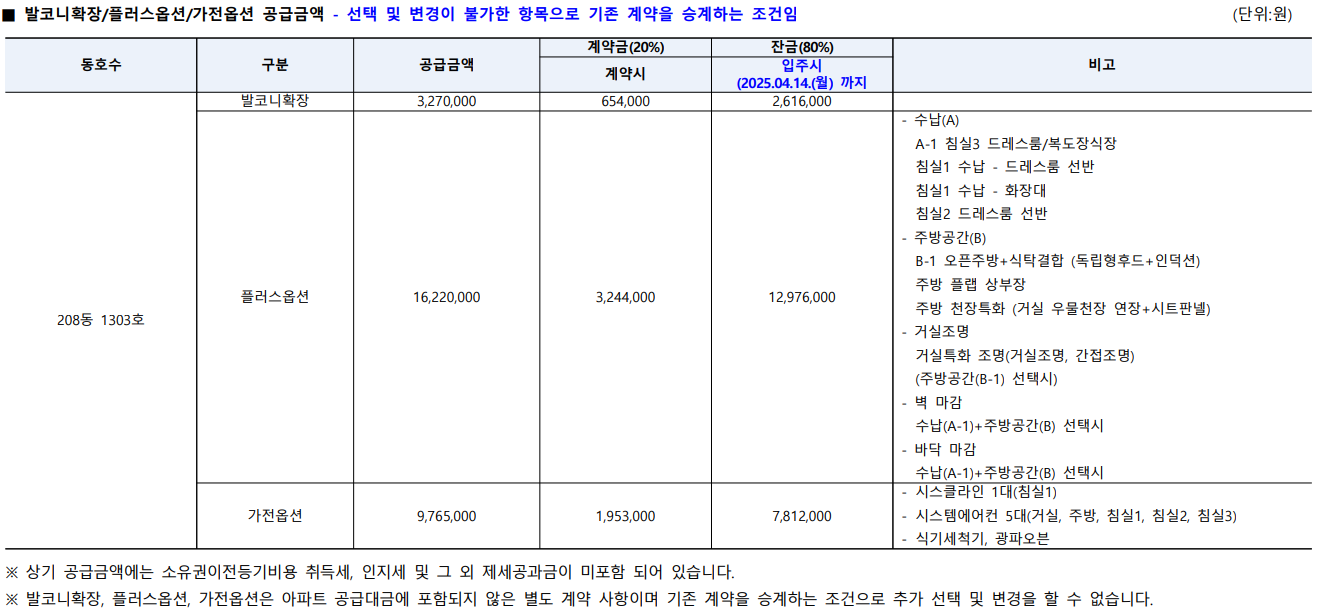 - 발코니 확장비, 선택옵션(유상) 비용 별도