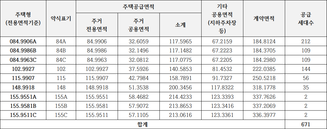 - 공급 면적 : 84㎡ A~C타입, 102㎡타입, 115㎡타입, 148㎡타입, 155㎡ A~C타입