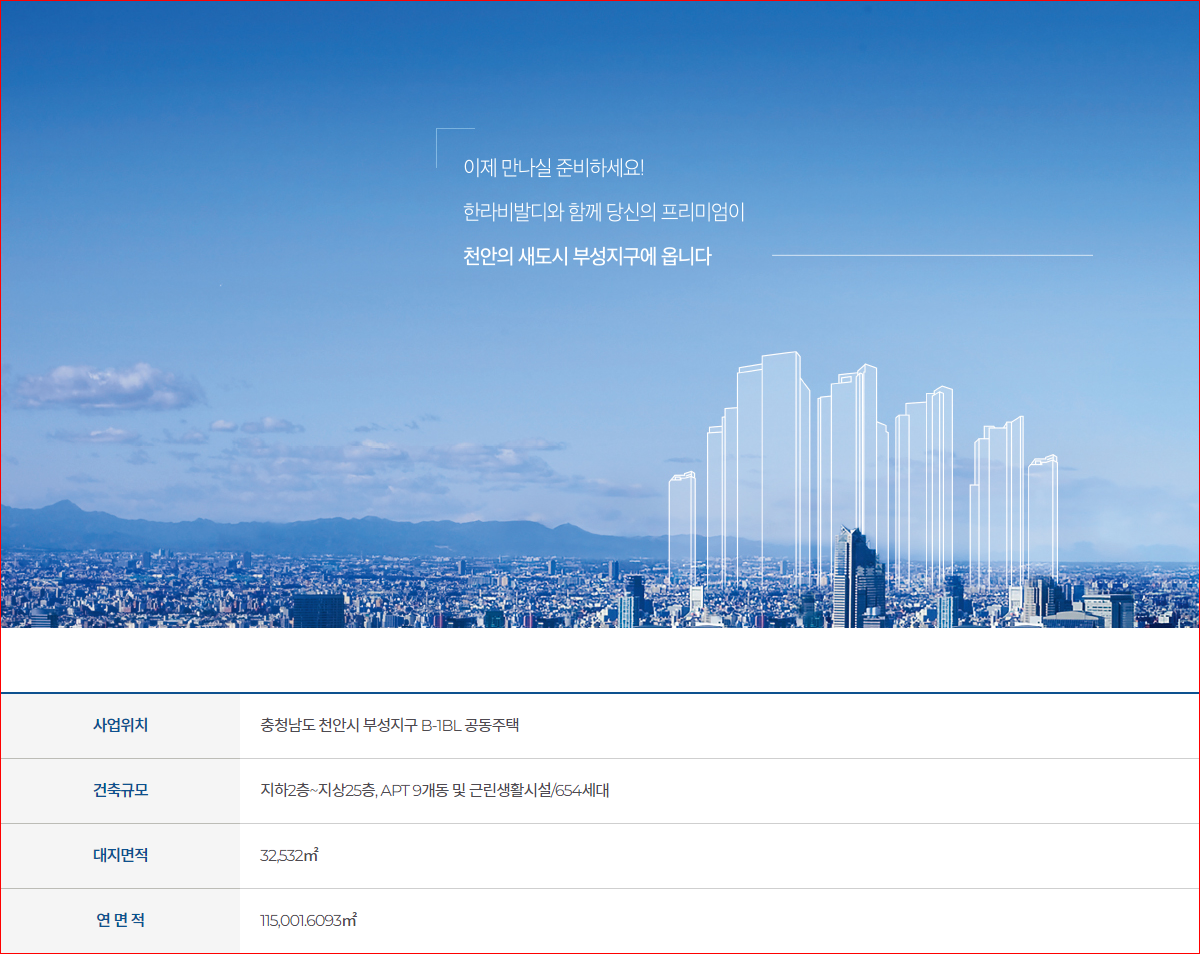 '천안 부성지구 한라 비발디' 아파트 단지는 천안시 서북구 부대동 760번지 일원 '천안 부성지구 B-1BL'에 위치해 지하 2층, 지상 25층, 총 9개 동, 전용면적 84㎡ 단일형으로 공급되는 아파트 단지입니다.