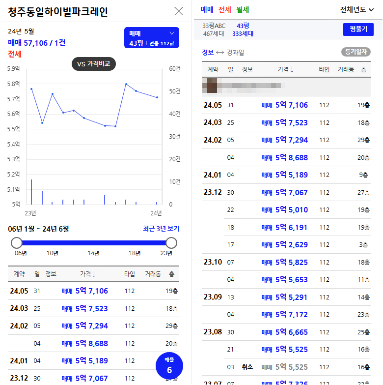 청주 동일 하이빌 파크레인 아파트 시세 및 최근 실거래가