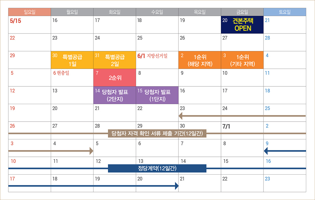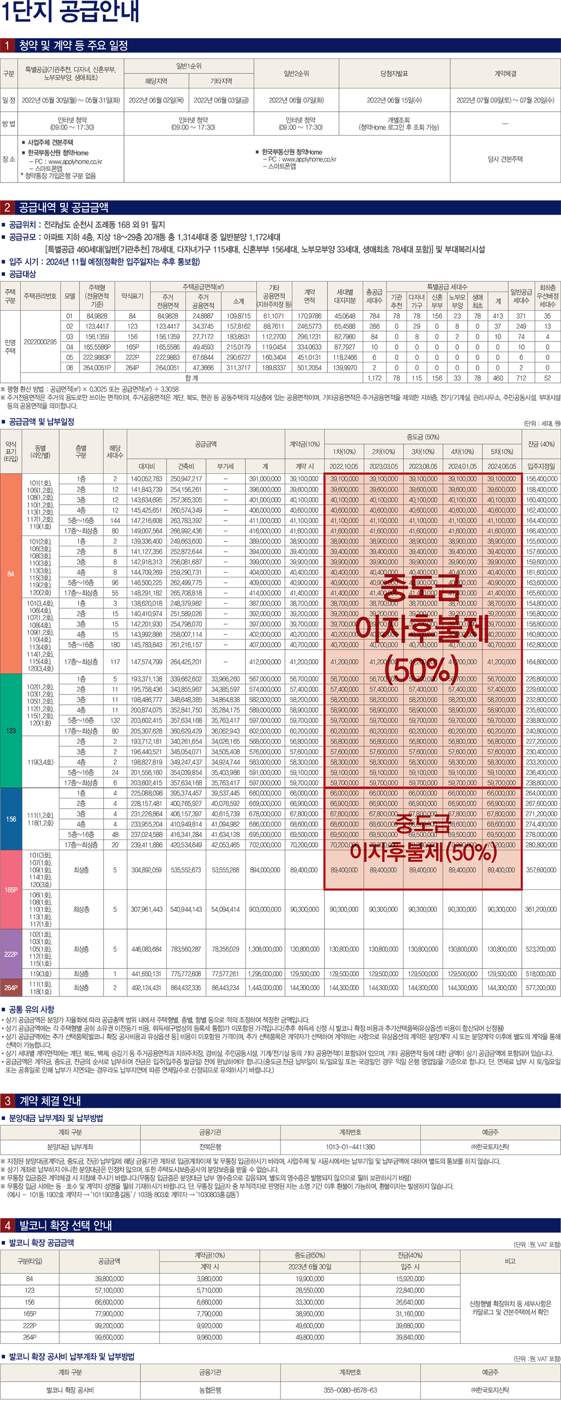 2022-06-02 일반공급 해당지역 1순위 청약 접수가 종료되었으며, 06-03 일반공급 기타지역 1순위 청약 접수, 06-07 일반공급 2순위 청약 접수, 06-14 ~ 06-15 아파트 당첨자 발표, 06-23 ~ 07-04 아파트 당첨자 자격 확인 서류 제출 기간, 07-09 ~ 07-21 아파트 당첨자 정당계약을 진행합니다.