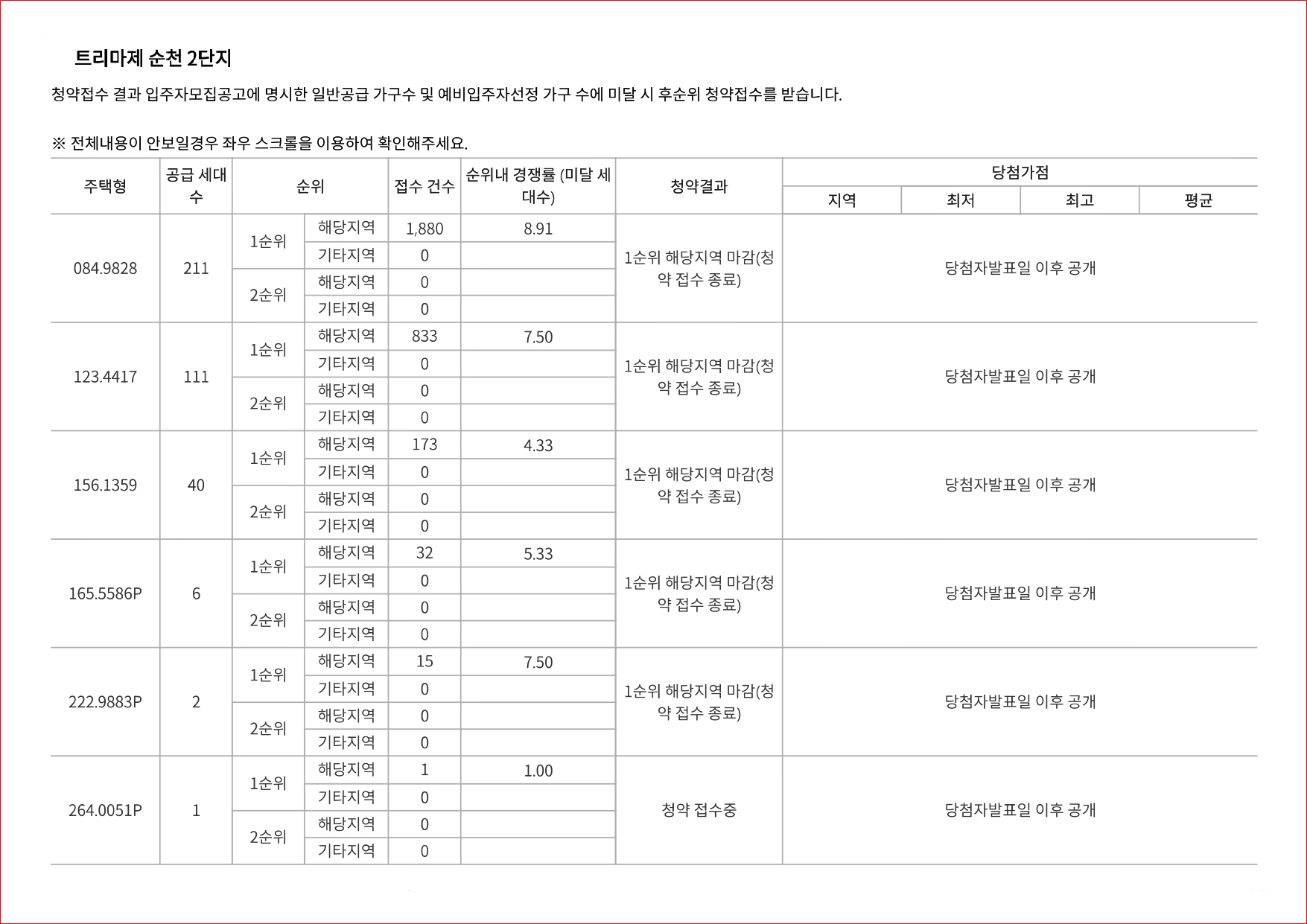 * 본 게시글에는 트리마제 순천 1단지 / 2단지 아파트 일반 청약 경쟁률 자료를 비롯해 분양가, 평면도, 분양 정보 등의 내용을 담고 있습니다 :)