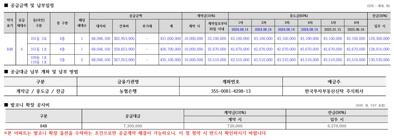 ✅ 본 아파트 공급금액에는 발코니 확장 및 추가 선택품목 비용이 포함되지 아니한 가격이고, 별도 발코니 확장 옵션 계약을 수락하는 조건으로만 공급계약 체결이 가능하오니, 이 점 청약 시 반드시 확인하시기 바랍니다. 이 외의 빌트인 가구 및 가전 등의 추가선택품목은 신규 계약이 불가합니다.