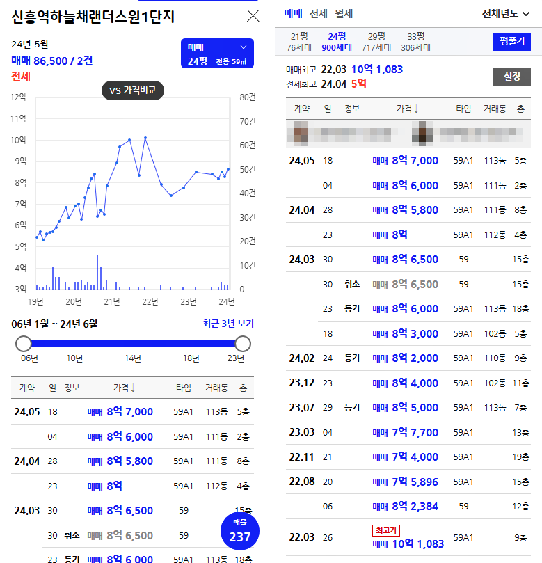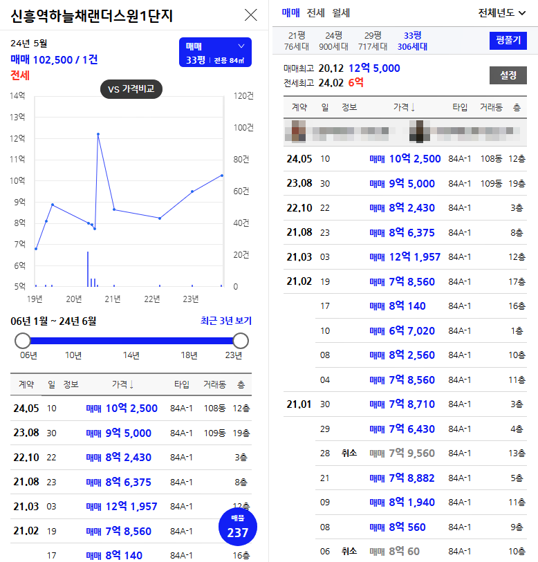 주변 시세의 경우 해링턴 스퀘어 신흥역 주력 타입인 59㎡ 타입과 84㎡ 타입 기준으로 단지와 가장 인접한 랜더스원 1차 단지 중심으로 25평형 약 8억 초반 ~ 후반, 33평형 8억 중반 ~ 10억 초반 때 가격 형성되어 있습니다. 평당 가격 환산시 25평형은 평당 약 3400만 원, 33평형은 평당 약 3100만 원 선으로 시세가 조성되어 있습니다.