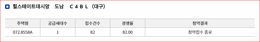 - 72.8558 A타입 / 1세대 / 접수 건수 : 82건 / 경쟁률 : 82 대 1